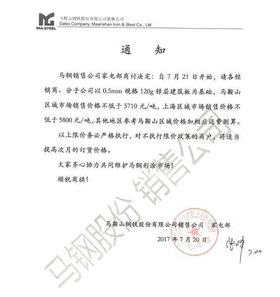 2017年7月21號(hào),馬鋼要求0.5*1000的彩涂卷不能底于5800銷售。違者必罰。